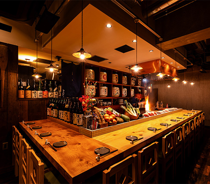 店主が探し集めてきた古家具やアンティークランプ、畳敷きの椅子など、すべてにこだわって創り上げた和の空間は趣に溢れています。燗酒と、それに最高の相性のお料理で、お客様の接待にも最適です。ほっと「日本人でよかった」と思える空間をお楽しみください。