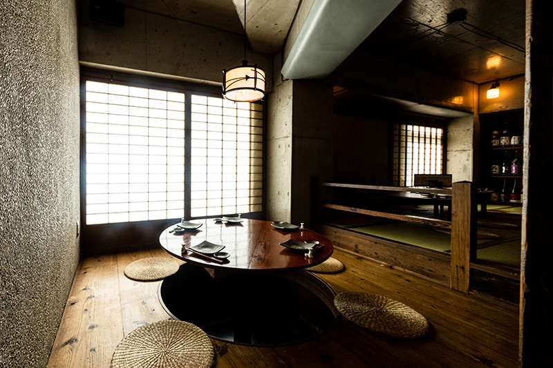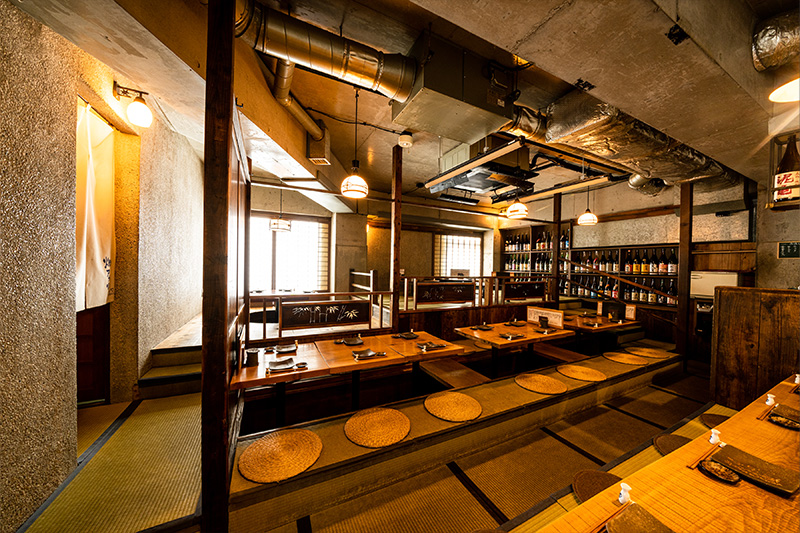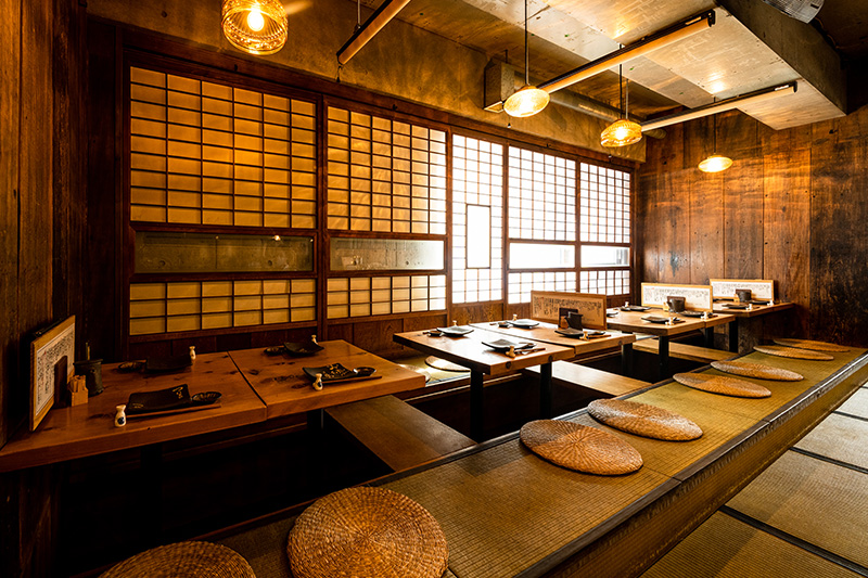 暖かみのある照明やなつかしさを感じる畳の香りが、古き良き日本らしさを感じさせるテーブルのお席。最大16名様までご利用いただけます。