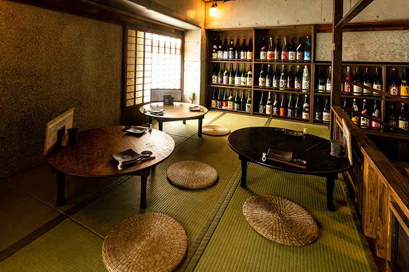 年季の入った柵に囲まれたちゃぶ台のお席。お座敷ながら、店内が見渡せる開放的な空間です。ずらりと並んだ日本酒や店主こだわりの古家具の趣をお楽しみください。最大10名様までご利用いただけます。